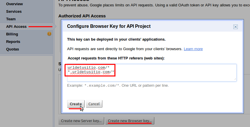 Google usa API Keys para evitar abusos con las API. Para obtener una, debes de entrar en API Access, y hacer click en Create a new Browser Key. Allí deberás de introducir los referers válidos (los sitios desde los que google de dejará llamar a tu API). Lo normal es usar algo como tusitio.com/*