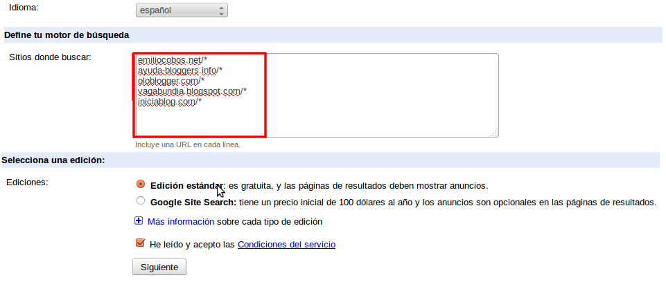 Como último paso, deberemos de crear un motor de búsqueda personalizado, con los sitios personalizados que queramos.