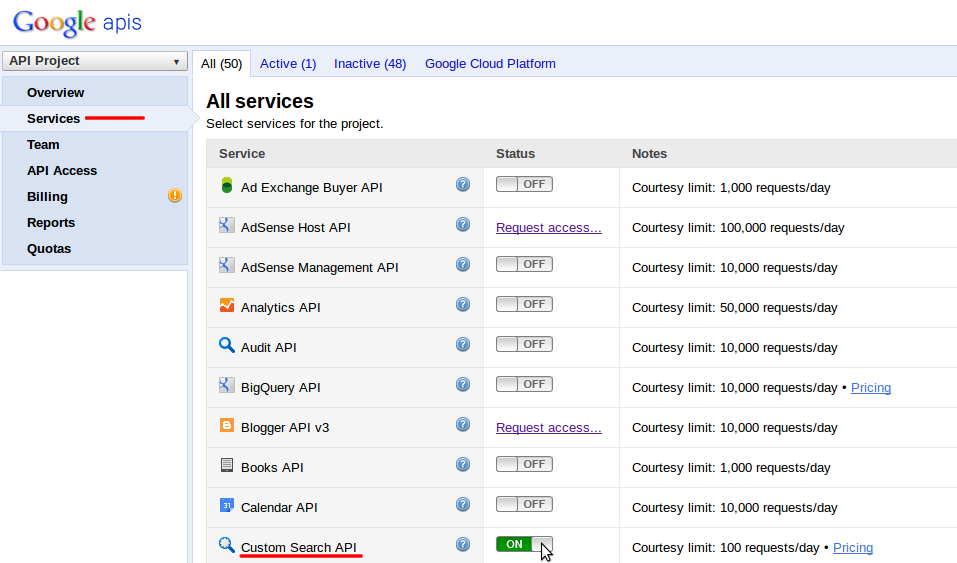 Vamos a la consola de apis de Google, iniciamos sesión y hacemos click en Services › Custom Search API.